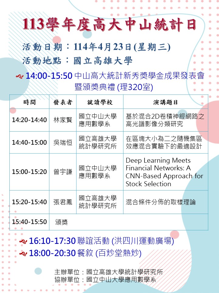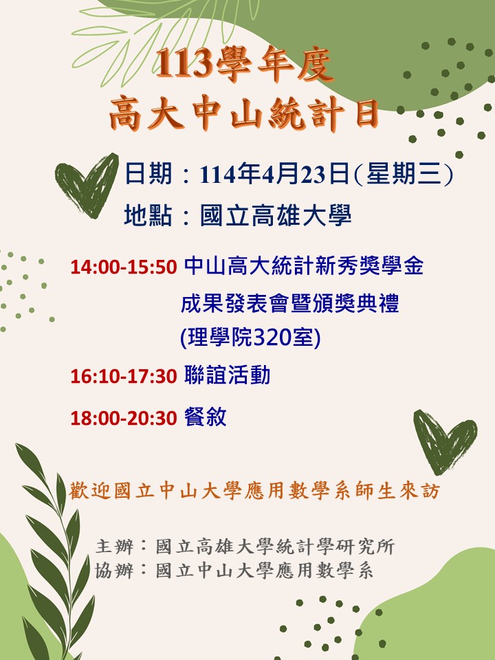 「113學年度高大中山統計日」活動將於 114年4月23日(星期三)下午在本校舉辦,邀請中山大學應用數學系碩博士班統計組師生前來參加。活動流程如下:
