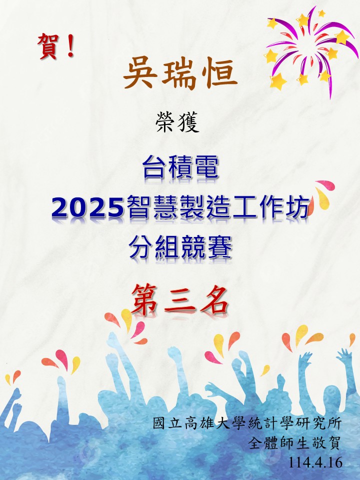 賀! 本所吳瑞恒同學參加【台積電2025智慧製造工作坊】榮獲台南場分組競賽第三名,恭喜他!