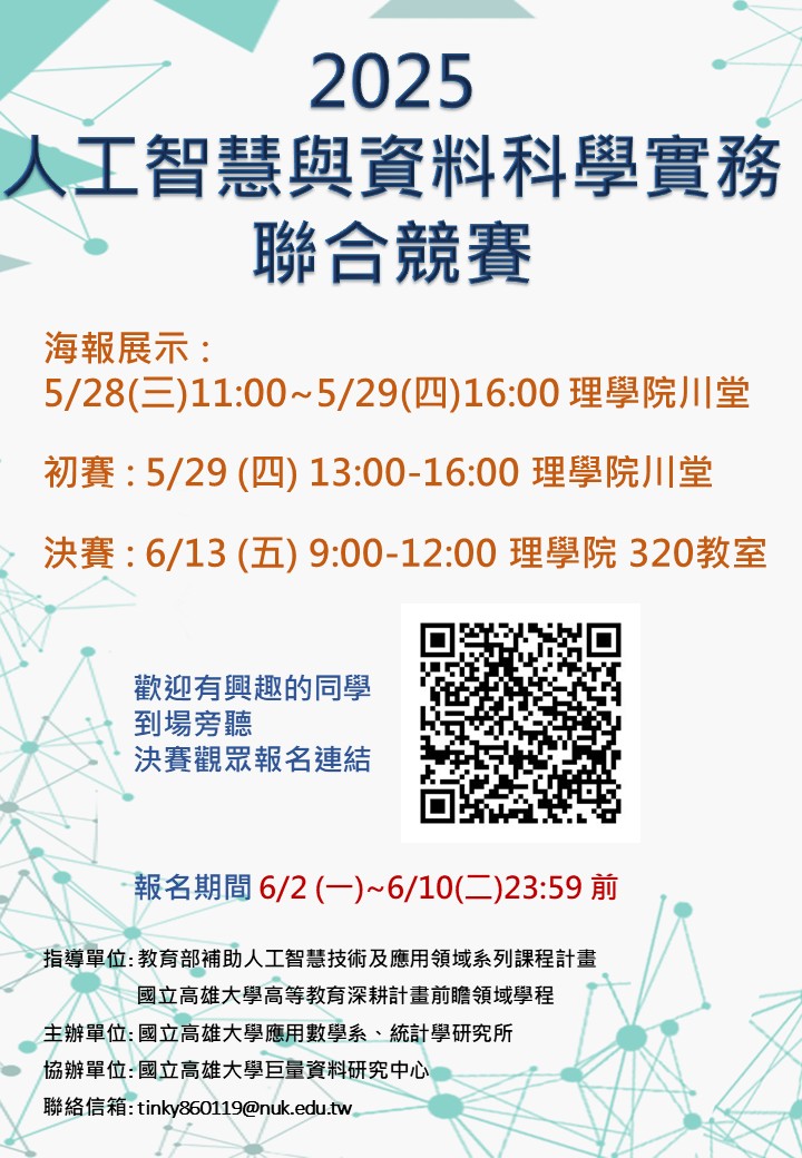 本所與應用數學系合辦【2025人工智慧與資料科學實務聯合競賽】,相關資訊如下: