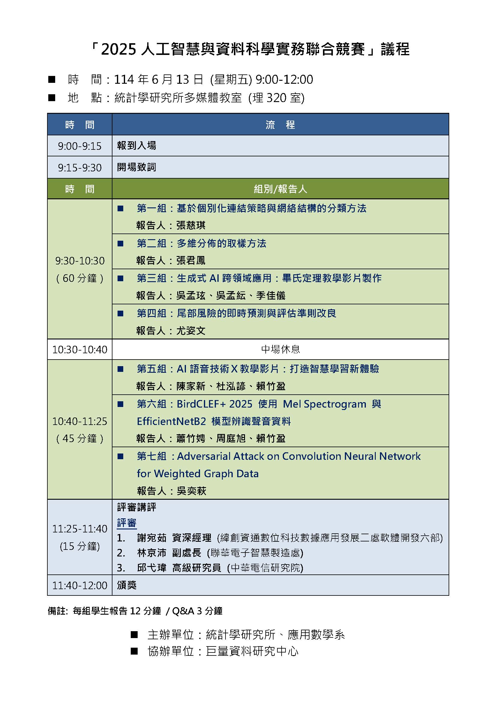 本所與應用數學系合辦【2025人工智慧與資料科學實務聯合競賽】,經過初賽評選後,以下七組隊伍晉級決賽:
