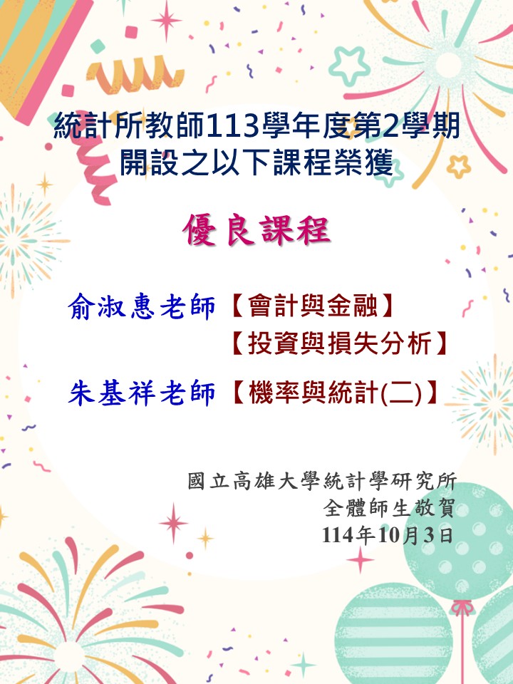 本所教師113學年度第2學期開設之以下課程,榮獲「優良課程」: