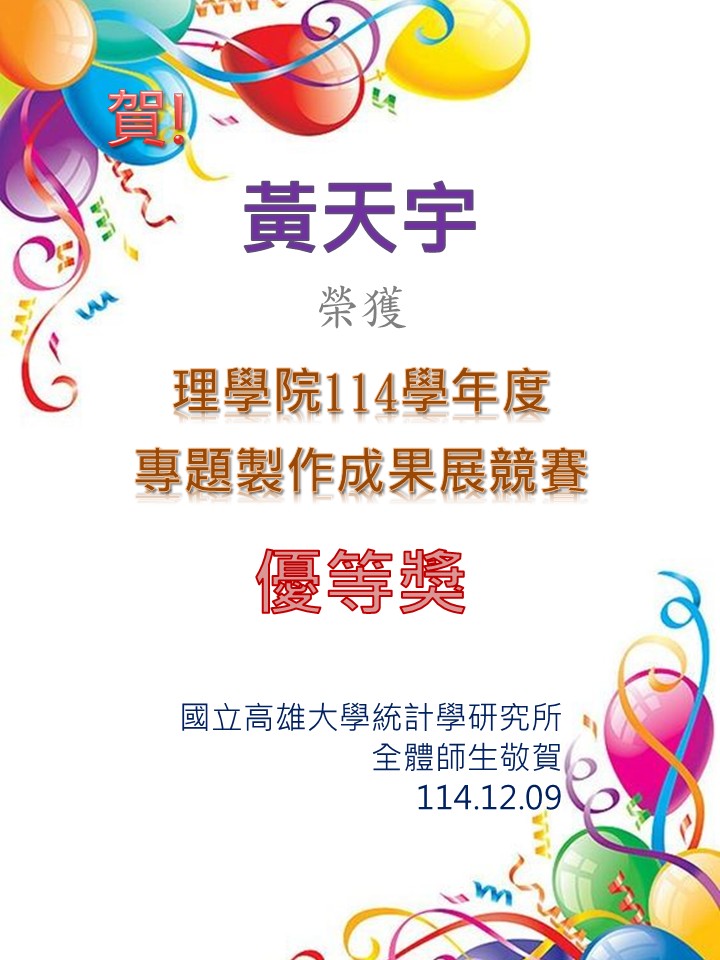 賀! 本所黃天宇同學榮獲【114學年度理學院專題製作成果展競賽】數學統計組-優等獎