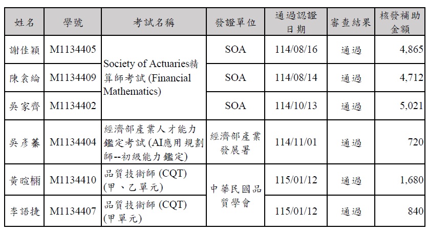 本所114學年度第1學期「獎勵學生通過專業認證考試補助案」,本次共計6位同學提出申請,審查結果如下: