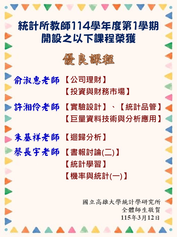 本所教師114學年度第1學期開設之以下課程,榮獲「優良課程」: