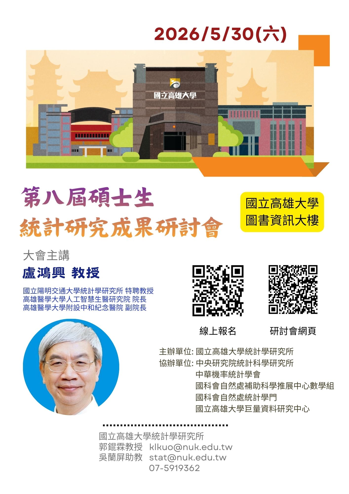 - 比賽方式:各組海報優勝者獲獎學金2,000元,並擇優推薦至第三十五屆南區統計研討會(國立成功大學統計學系主辦)進行論文短講。